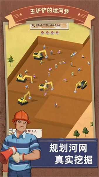 王铲铲的运河梦是一款以运河建造为主题的模拟经营类游戏。玩家在游戏中扮演的河道的建筑包工头王铲铲,可以通过招募多位工人一起,完成一项修建运河的大工程。玩家能够跟随主线任务,一开始会负责挖通从稻村到金华镇...