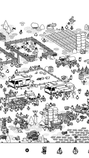 隐藏的家伙是一款黑白手绘画风、寻找物品玩法的冒险游戏。游戏采用了闯关模式,每一关中通过黑白风格画作的形式,为玩家展示出了一个具有丰富物品、人物的场景。而在游戏界面的下方,提供了玩家需要从场景中寻找出来的物品,全部找到之后就可以通关。采用了黑白的画风,使得不同物品之间的辨识度并不会很高,加大了游戏的难度,但也能让玩家把注意力集中到找东西上来。