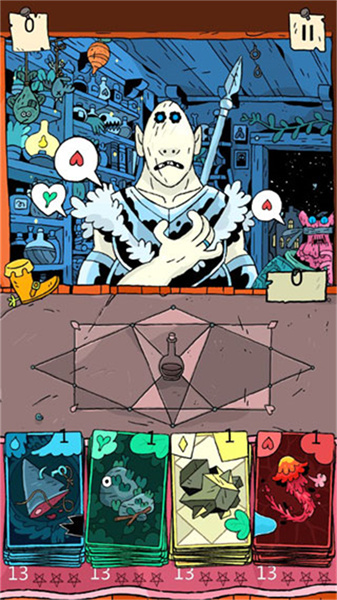 3、学会制作药水之后,接下来玩家便可开启商店完成营业了,记住来到这里的每个客户都有特殊的订单,其中上面的文字泡泡显示了它想要的药水原料,你必须至少使用1张客户想要的配料卡,否则游戏结束。