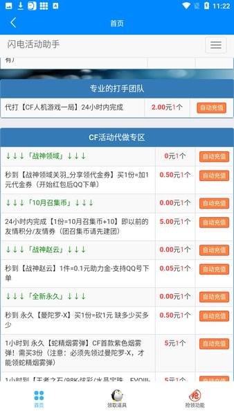 闪电活动助手app是一款专为游戏玩家们打造的活动领取助手,在该平台当中玩家们可以随时的查询到游戏当中活动信息,有已完成的任务直接点击就可以领取到活动的奖励。活动奖励的信息都是实时领取到游戏当中的,玩家们在活动助手当中就可以随时的进行了解查看领取的情况,不需要再进入到游戏当中。助手支持CF,逆战,CFHD,活动数据实时更新,为玩家带来海量优质的活动道具选择,无需频繁的切换活动页面,一键就能领取活动道具
