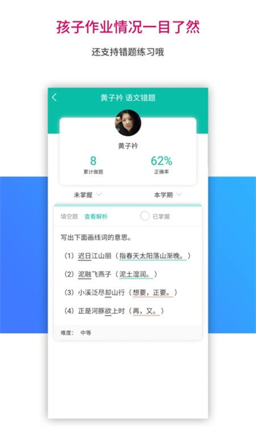 2、支持进行教材同步练习服务,参与活动,展示才艺,并了解孩子学习情况班级动态。