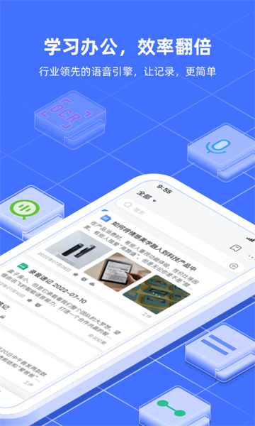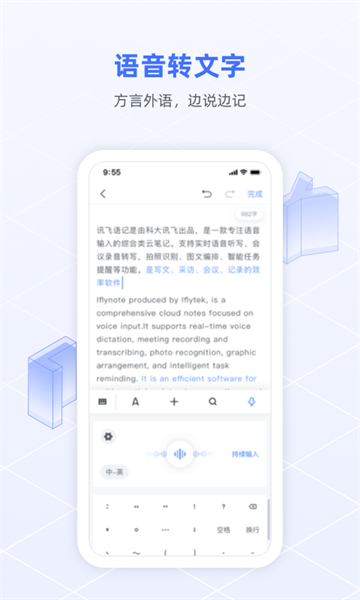 讯飞语记app依托了十分领先的科大讯飞语音转文字技术,能帮助大家去快速翻译英语、日语、韩语等语言文字。创建了无限文字云盘大空间供办公网友去存储笔记信息。软件可以迅速的把听到的语音转换成为文字,而且准换准确率很高,轻松解放网友双手。