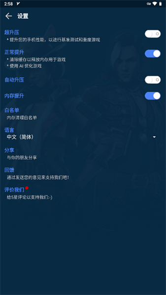5、然后建议去设置选项里将超升压也打开,这样可以获得更好的游戏体验。