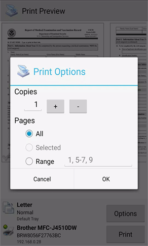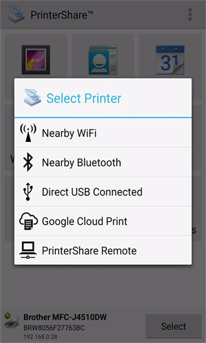 通过共享行动打印来自设备内存和来自GoogleDrive、OneDrive、Box、Dropbox等应用的云存储提供商的照片和图片(JPG、PNG、GIF)、电子邮件和附件(PDF、DOC、XSL、PPT、TXT)、通讯录、议程、短信/彩信、通话记录、网页(HTML)以及其它数字内容。