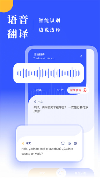 西语翻译app收录了海量的西班牙语言,对喜爱西班牙语言朋友可以更好的去了解学习。翻译外语的数据都十分的精准,能够带来准确的外语翻译见解。内置了权威的西语词典能够翻译出专业词汇,还有拍照翻译和语音翻译,就算外语不好也能快速和外国友人交流。