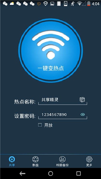 1、一键开启便携式WiFi热点,手机立刻就变成3G路由器,并共享出各种网络流量给其他设备使用。