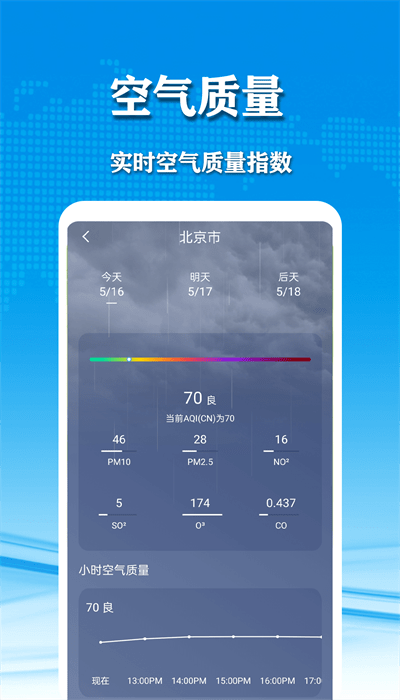 1、提供详细天气空气指数,各地区的PM2和PM5能精确检测,天气和环境监测数据真实。