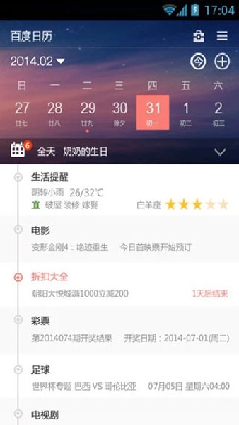 百度日历是一款提供用户的日历查看、天气提醒和闹钟提醒功能的生活小工具软件。准许使用者自由的切换不同的日历、周历和月历显示形式。还可以配合黄历。随时掌握日期,通过添加日历插件和月历插件等小工具,小工具可以直接显示在设备桌面上,使用者无需进入软件即可查看日期。还可以再这里自由设置指定日期需要完成的任务类型。
