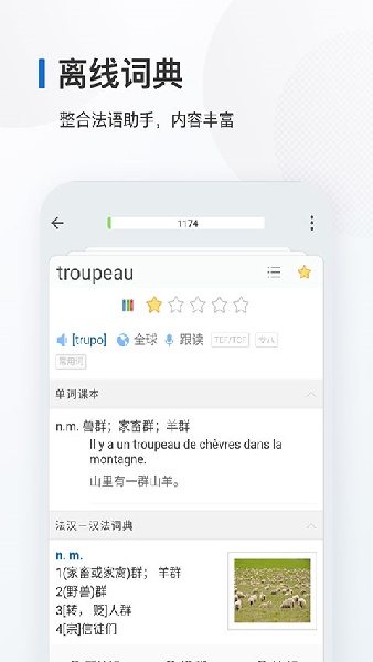 法语单词,又叫法语背单词,是一款专为法语学习者背单词的学习软件,涵盖了北外法语、你好法语、走遍法国、法语综合教程等主流法语教材,软件会根据艾宾浩斯记忆曲线,内置了科学高效的记忆算法,识别当前单词的熟悉...