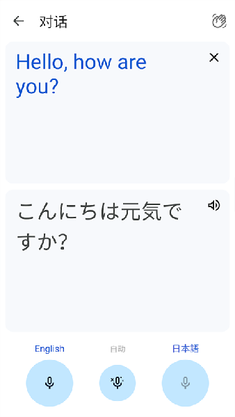 1、点击麦克风按钮并选择语言开始对话,自动识别被使用的语言,帮助使用者流畅交流。