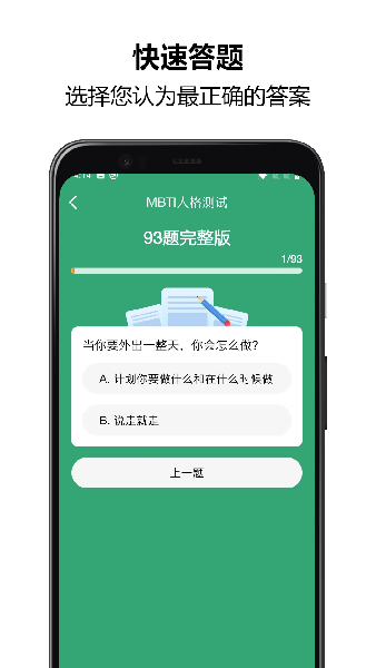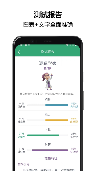 MBTI人格测试可以让测试者在软件上通过测试找到自己的兴趣爱好以及性格特点,方便测试者改变人际关系和对未来的规划,测试报告的数据都是更具测试者选择提供的真实反馈,帮助测试者改善自己性格的缺点。