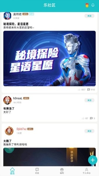 乐社区是一款专为喜爱奥特曼的玩家打造的游戏社区平台,同时还提供了其他游戏的资讯,带来了全面的游戏攻略资讯,攻略类视频更能帮你成为游戏大神。为玩家带来更加全面的游戏服务,可以在这里领取很多游戏福利,提供...