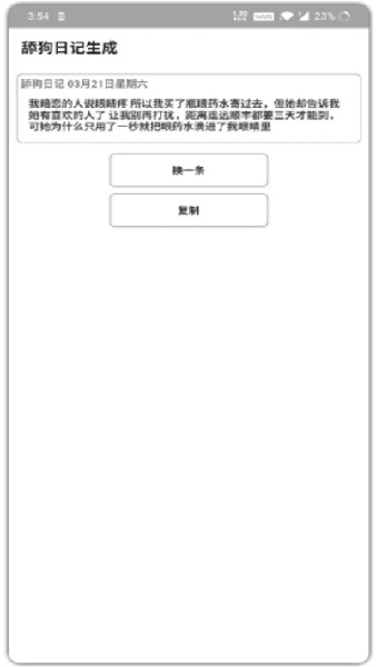 舔狗日记是一款自动生成舔狗文章的软件,可以一键点击,然后生成个人日记,看起来既心酸又搞笑,了解到一个现实,人人都可以被舔,也能够是舔狗,不用自己绞尽脑汁想,自动生成这些心酸娱乐,方便笑对人生。