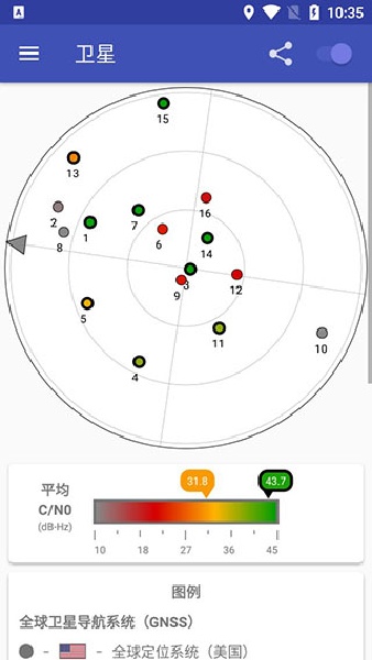 2、图形化方式展示可见卫星的数量、信号强度及分布,帮助使用者分析定位环境。