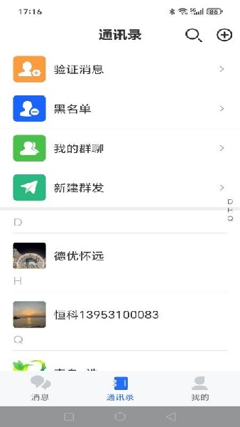 2、用自己的手机号码注册完成后,就到了通讯录的页面,消息、通讯录、我的功能在底端展示。