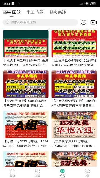 1、在牛王争霸频道中可以查看到各种牛王争霸赛的赛事信息,轻松参与或观看比赛。
