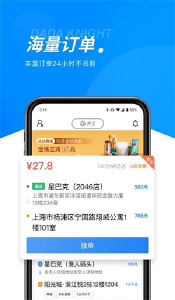 2、软件提供24小时订单推送,任何时间都有订单,还有专属的夜间送单补贴。