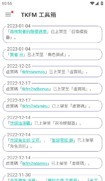 tkfm工具箱是一款由第三方爱好者专为天下布魔开发的辅助软件,为玩家提供游戏最新公告资讯信息,玩家无需登录游戏也能第一时间了解近期游戏动向,软件内有角色数据计算器、角色评价表生成器、虚宝码、邀请码漂流瓶等功能,为玩家提供更加便捷的游戏服务,尤其是其中的虚宝码功能,可以帮助玩家收集最全最新的虚拟资源兑换码。