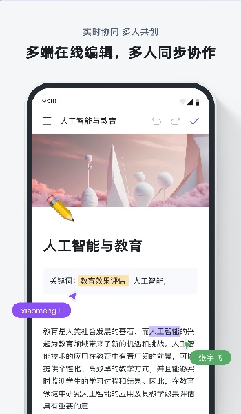 1、支持多人在线编辑和交流,高效协同完成内容共创优质作品,实现创业共享化。