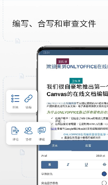 onlyoffice支持office编辑功能,包括文本编辑、表格处理、电子演示文稿等,增加了chatgpt插件,极大减轻办公人员的负担,能与同事一起协作处理文档,查看、管理和编辑本地文件,轻松提升办公效率。