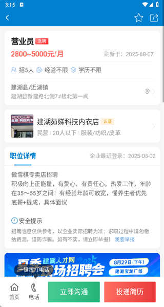 2、选择您所感兴趣的岗位,就能看到这个工作的详细信息,有任何的想法都是可以直接电话联系。