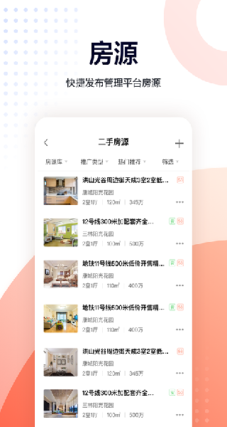 1、支持二手房、新房、租房、商业地产等多种房源的发布与管理,让员工可轻松进行管理。